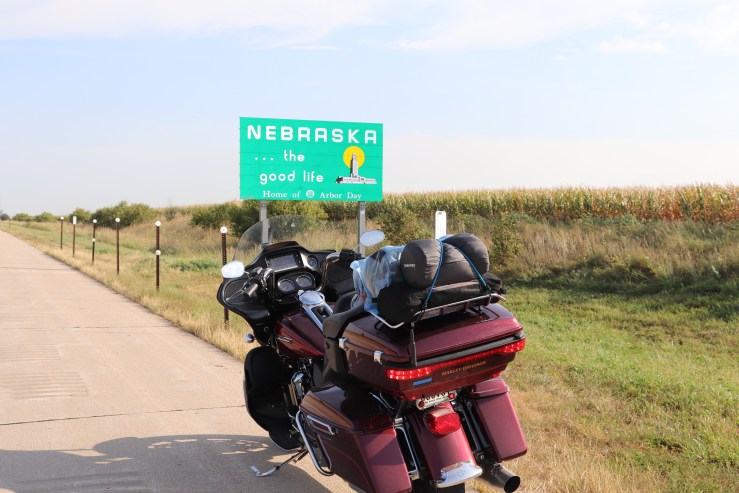 The interstate turns into three lanes at Lincoln but runs along the north edge of the city so I never really hit any city traffic. Always happy for that. Another stop in Gretna. Needed fuel, water and a short break to stretch. As we started back down the on ramp I noticed another rider pass on the interstate, haven’t seen very many so far. We caught up to him quickly and found Libby’s sister – same bike, same color, less cargo. I waved and throttled ahead towards Omaha.