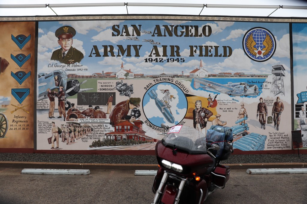 The San Angelo Army Air Field Mural is a tribute to the Army Air Forces bombardier training base activated here shortly after the Pearl Harbor attack. The base was built on the not yet complete Carr Field Municipal Airport and was used to train bombardiers using the highly classified Norden bombsight. After the war ended, the original land and most of the government-built buildings were transferred back to the city. The field was renamed as Mathis Field in honor of Lt. Jack Mathis.