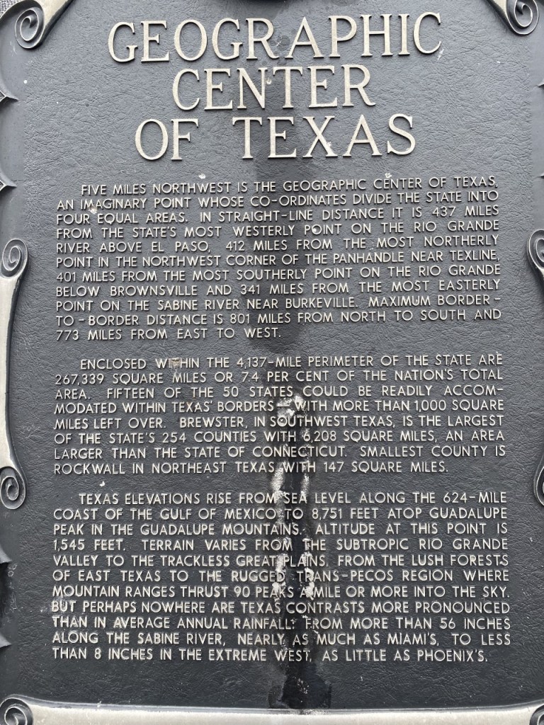 Stop one for today is the Geographical Center of Texas, or the sign that tells you about it. According to the sign the actual location is five miles northwest of this location, likely on private land. The coordinates of this spot divide the state into four equal parts. I won’t go into all the details given on this sign but will post a photo of it below should you choose to read it.