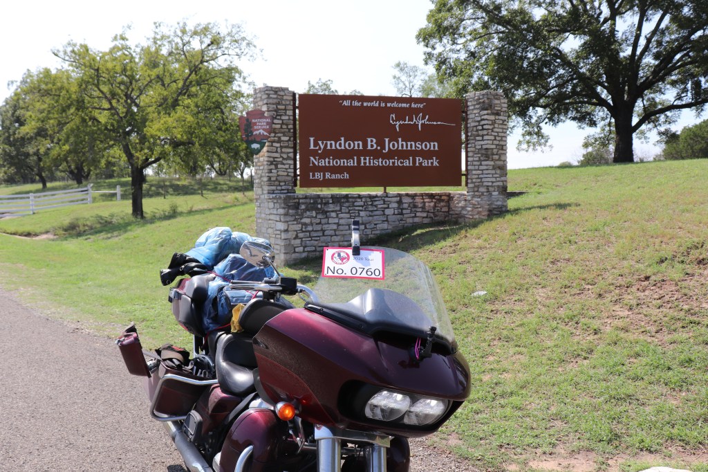 On to the next stop. The next place we’re going is near Johnson City, the Lyndon B. Johnson National Historical Park. Need another park sign photo. Much of the scenery today was the same. Very little in the way of farm land, mostly fields of grass with varying densities of trees and brush. I’ve started to see more livestock by now, mostly goats but some cattle as well.