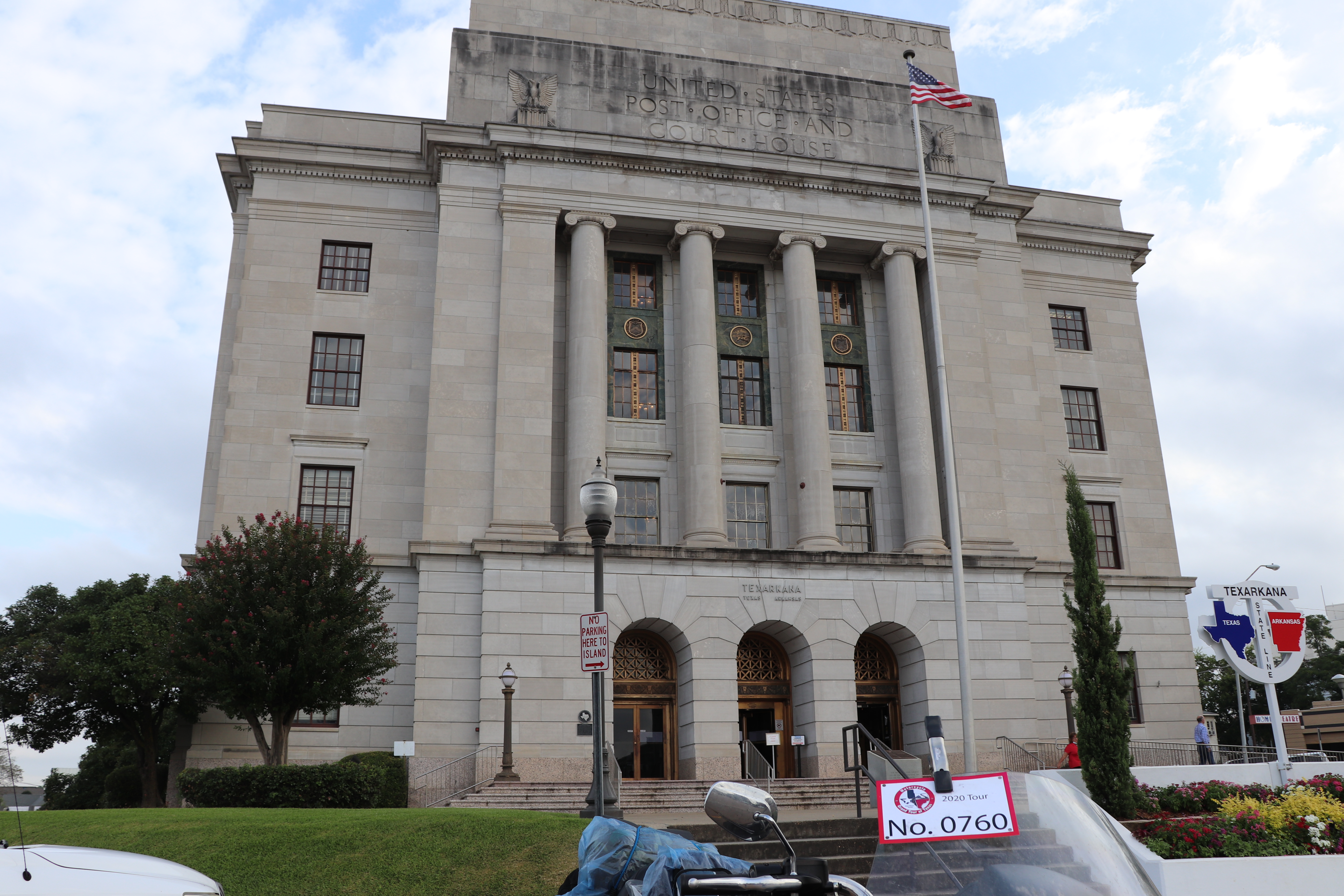 We left out to head to our first stop, the Texarkana Post Office/Court House. It’s just down the street from where I stayed the night. It sits in the middle of Stateline Avenue, the same street I had to cross just to buy beer last night. It’s a rather large concrete building with a touristy sign our front. As far as I know, it’s the only government building that straddles a state line. It’s a fairly busy morning here and all the parking is full so I’m parked in a no parking area. I get my photo real quick and then head for Paris, about 100 miles away.