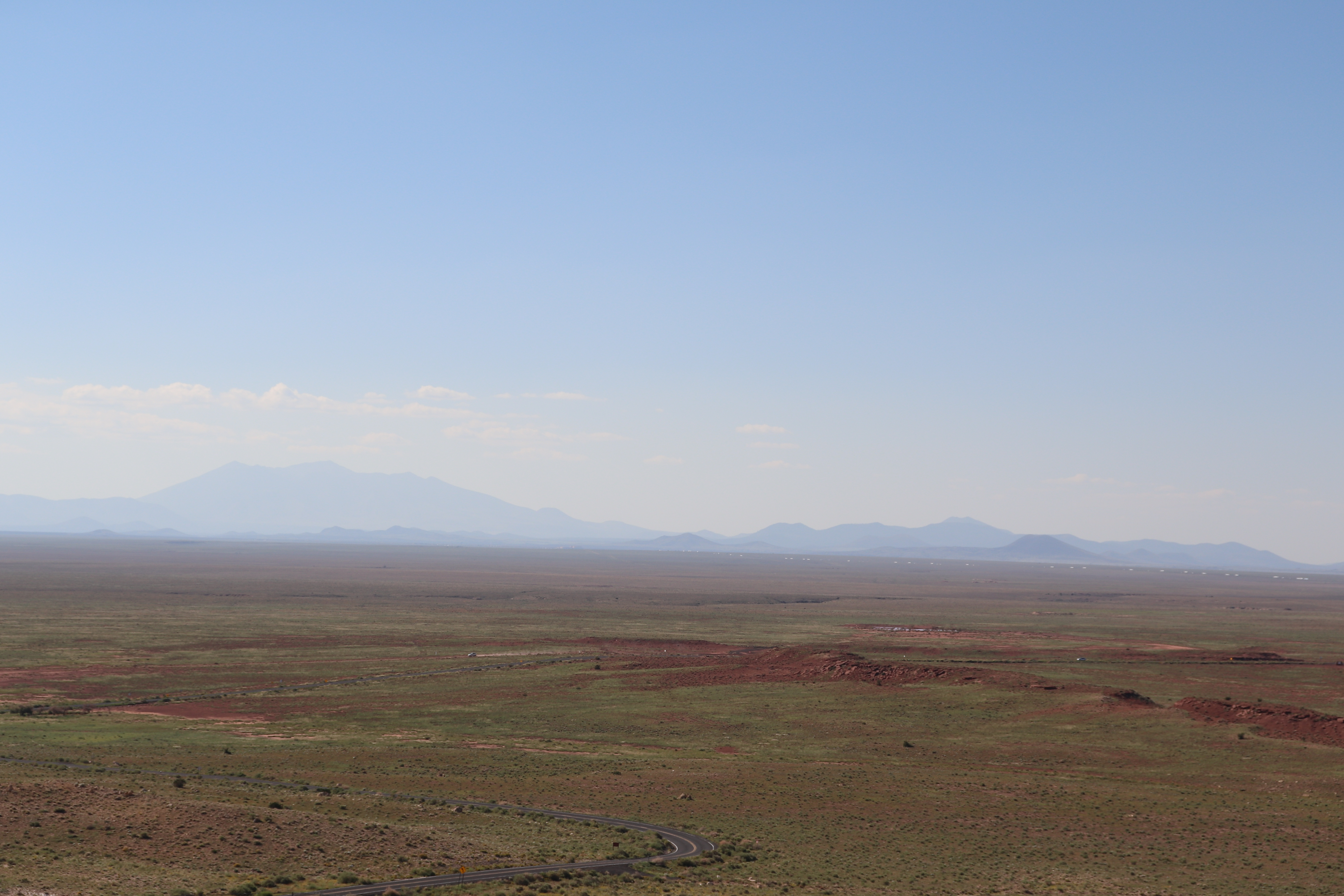 Perched atop the crater I could see I-40 in the distance and the purple shadow of Humphrey’s Peak. Flat land everywhere else. We trekked back to the interstate and continued the last 40 miles to our destination for the night, Flagstaff. Flagstaff lays in the foothills of the mountains and this is where the trees return. The hills are covered with them.