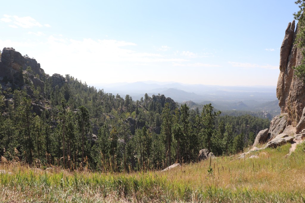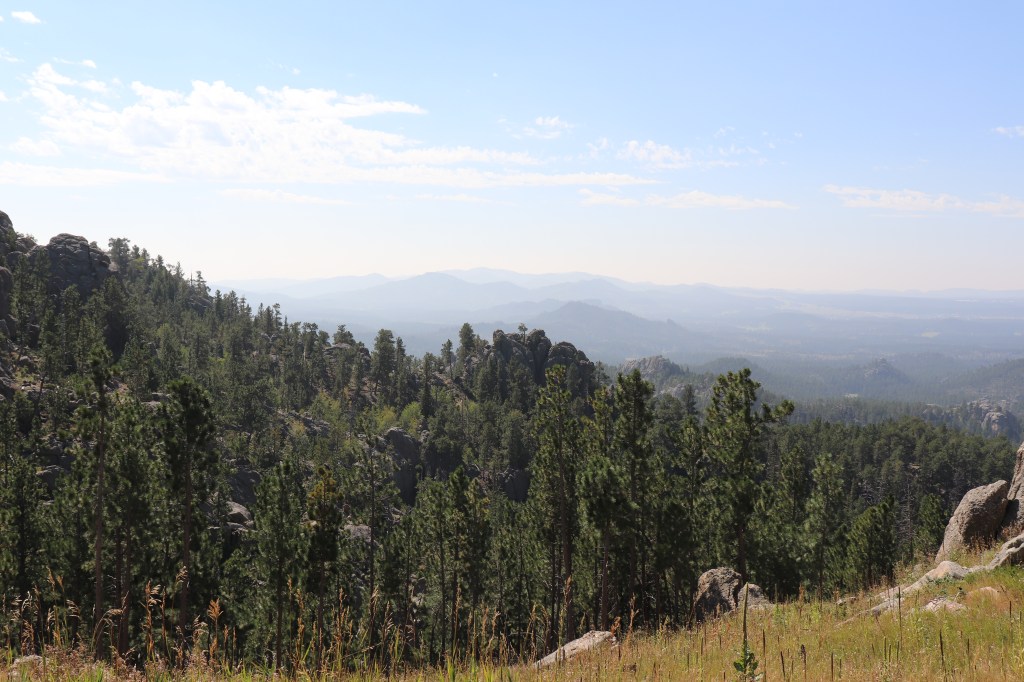 We pass Pactola Lake which is quite large and surrounded by tree covered hills. The smoke has cleared up a good bit and the views across the lake are much better then a few days ago. It’s a few more miles to Sheridan Lake. It’s a smaller lake and there isn’t much of a view of the water from the road, but it too is surrounded by forested hills.