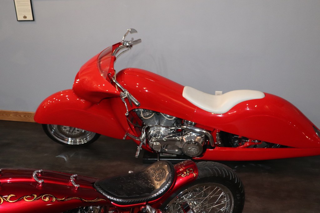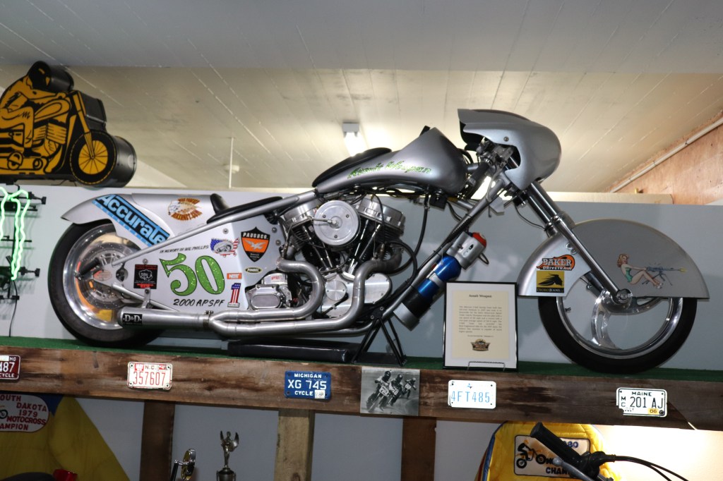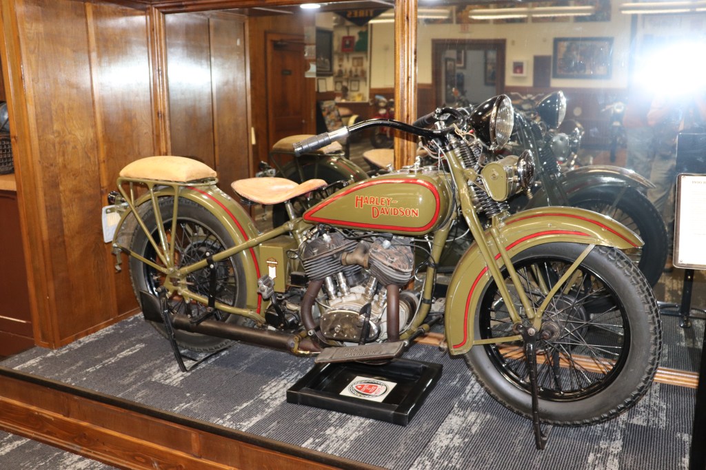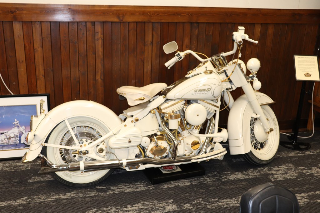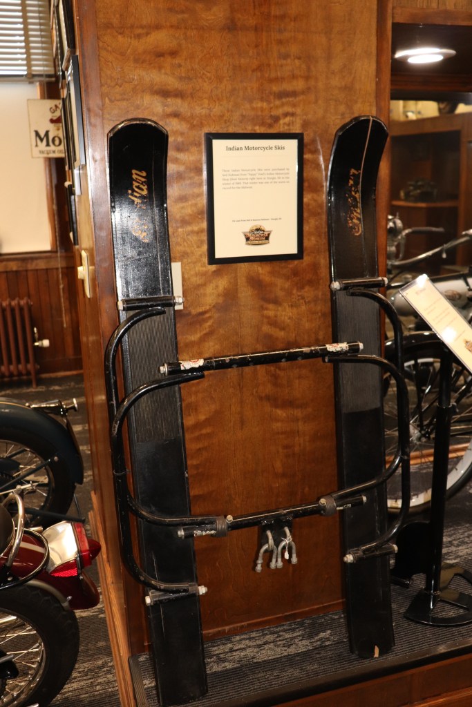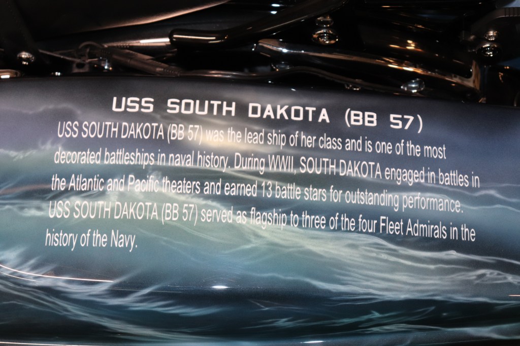 I’ll explain a couple of photos from the museum. The blue box is early GPS. It’s a printed list of directions in a rolling box. Turn one knob and advance the directions, the other knob will roll them back. The black ski looking thing is, well, skis for an Indian motorcycle. The late model bike pictured is a tribute bike to both the USS South Dakota (BB-57) and USS South Dakota (SSN-790). The USS South Dakota (BB-57) was the lead ship of the South Dakota Class battleships (4 in total). It fought extensively in WWII and was scrapped in 1962. The USS South Dakota (SSN-790) is a Virginia Class nuclear submarine still in service. There is a key to this motorcycle onboard the sub and any crew member is able to take this bike out to ride anywhere in the state of South Dakota. I seriously doubt any of them would have much time to travel here and then ride around the state. Still a cool bike and thought.