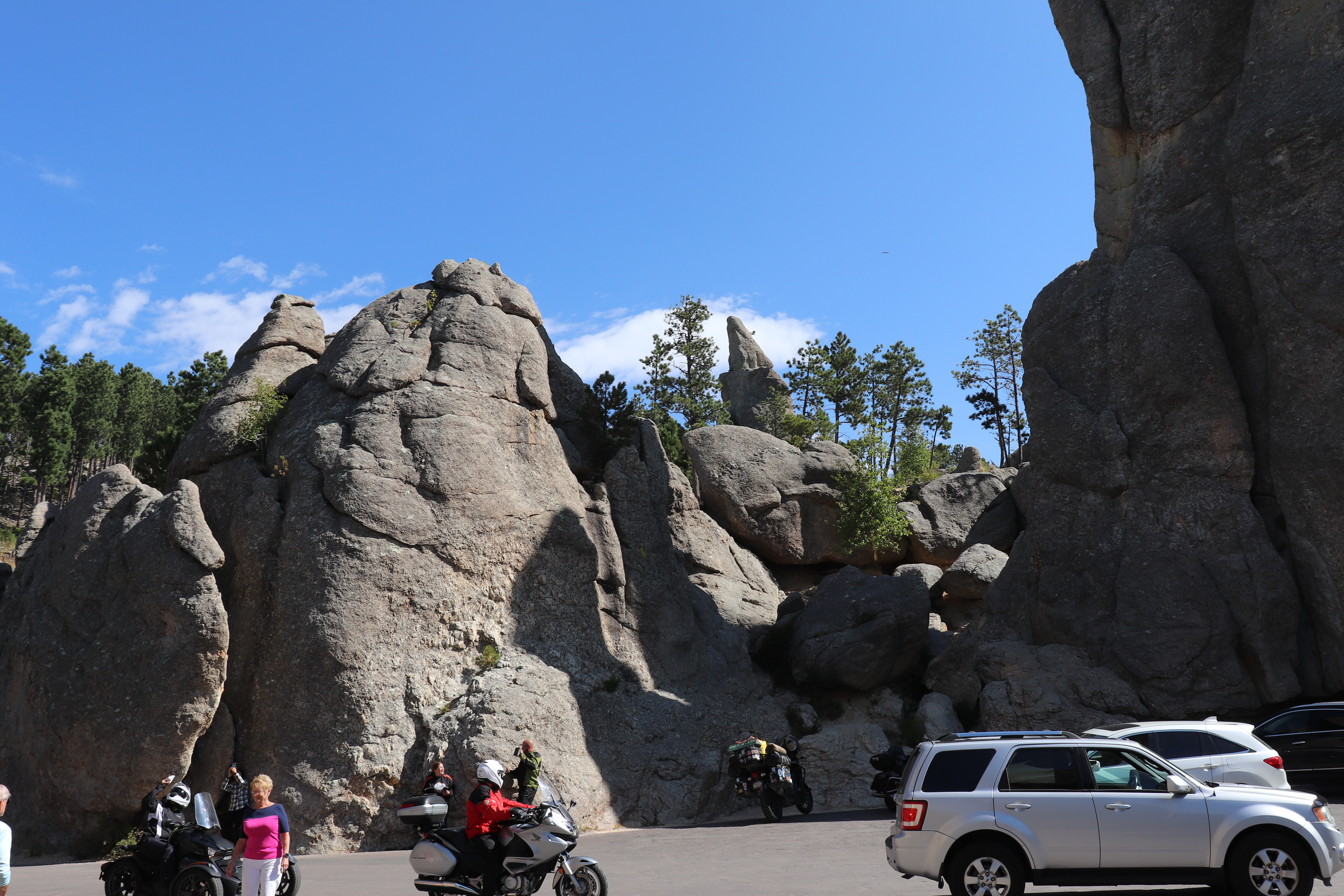 Well, it was another beautiful day for riding. After a quick shower we’re off to Needles Highway which is back towards Crazy Horse. It’s a quick run down through town then on to a nice two lane road that winds through the forested hills. It’s about 45 miles to get to the turn off for Needles but it’s fairly slow going.
