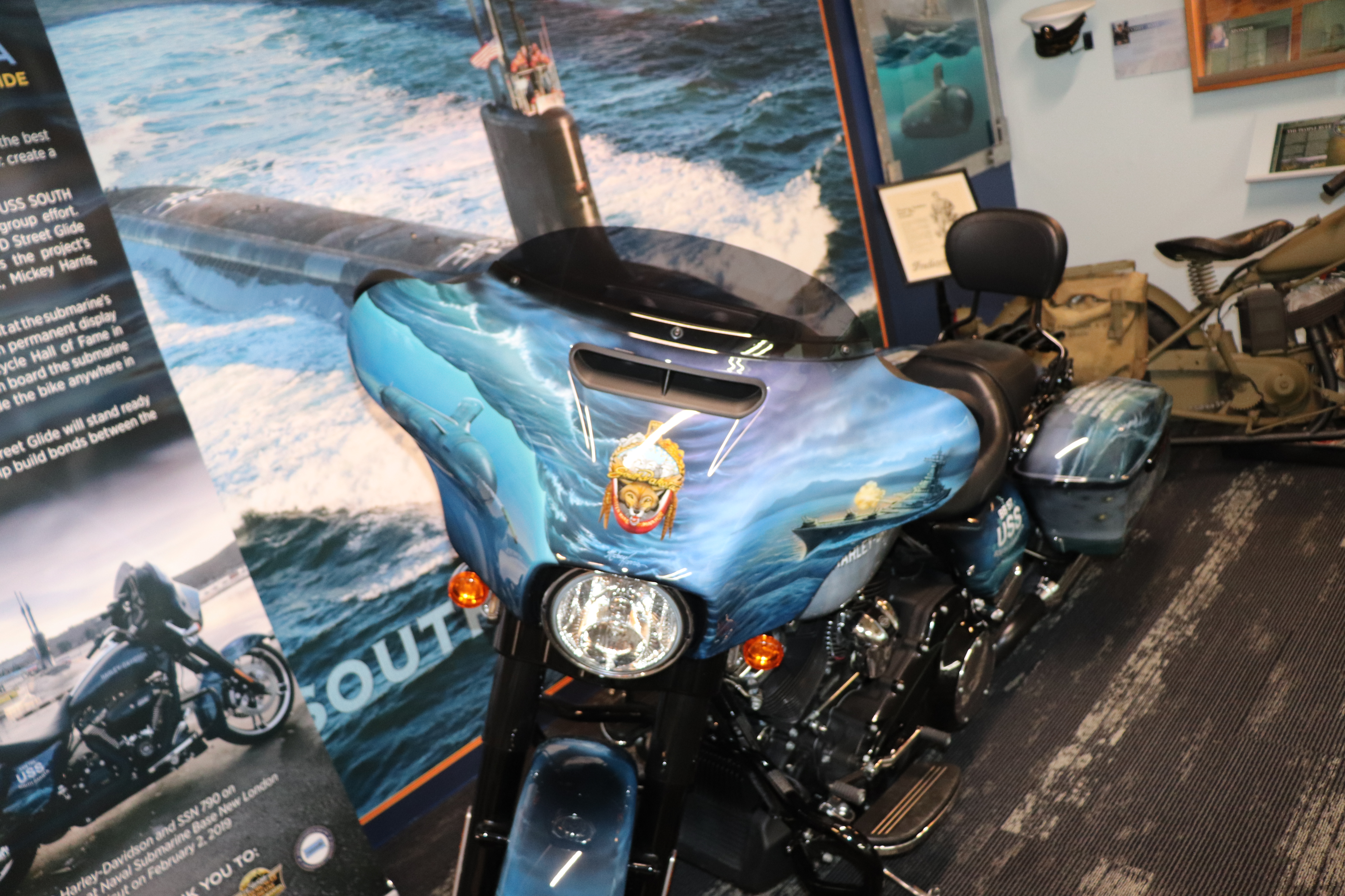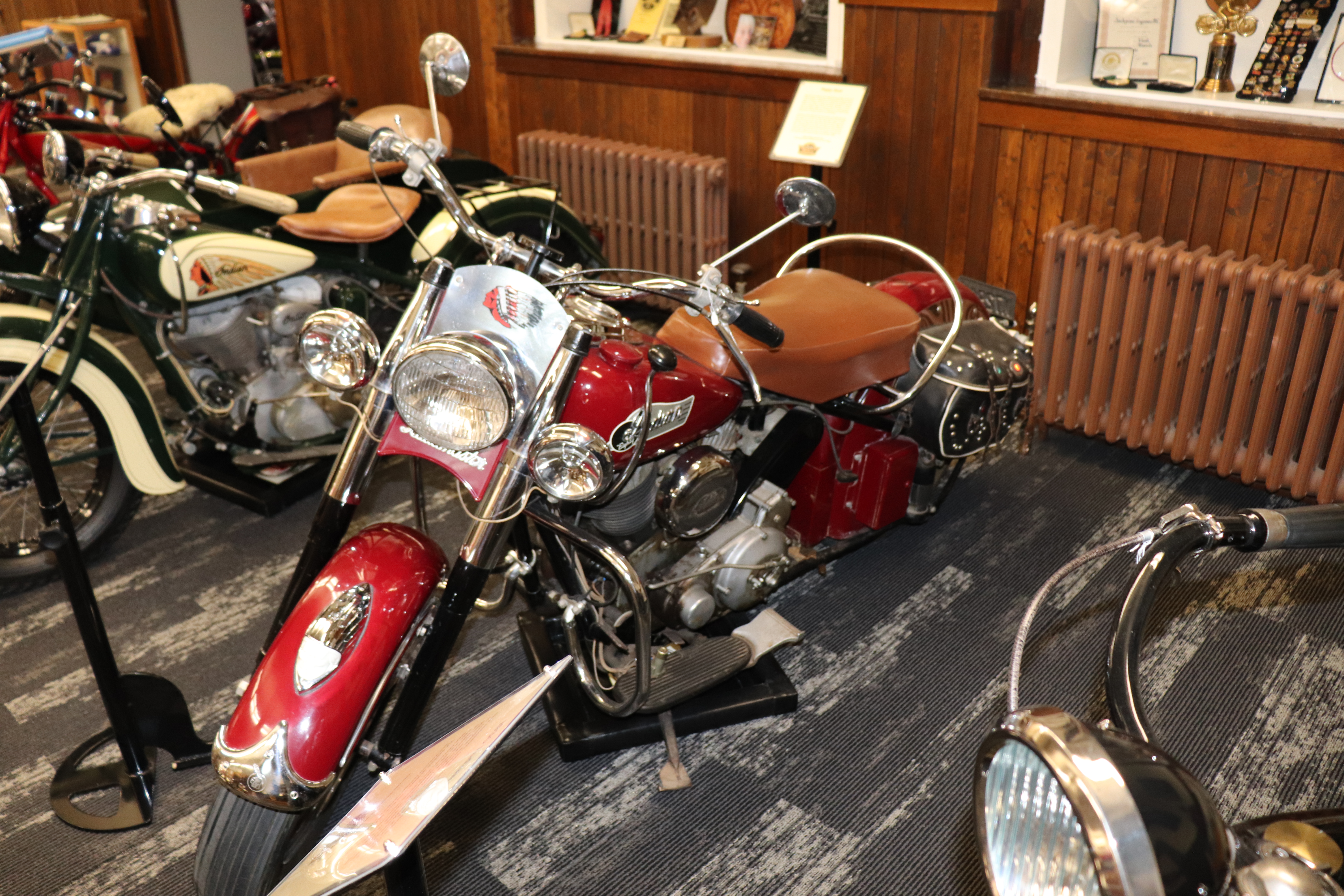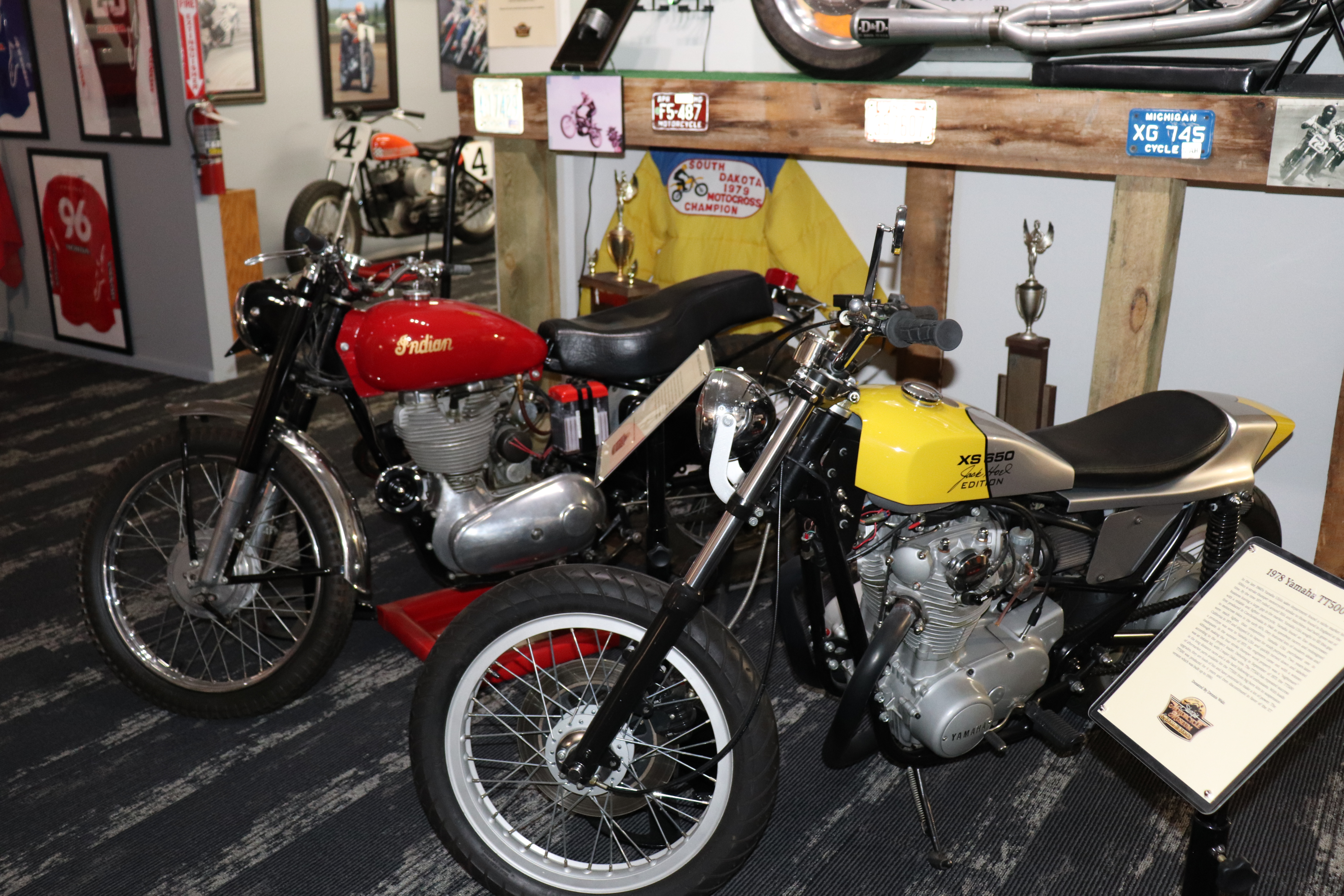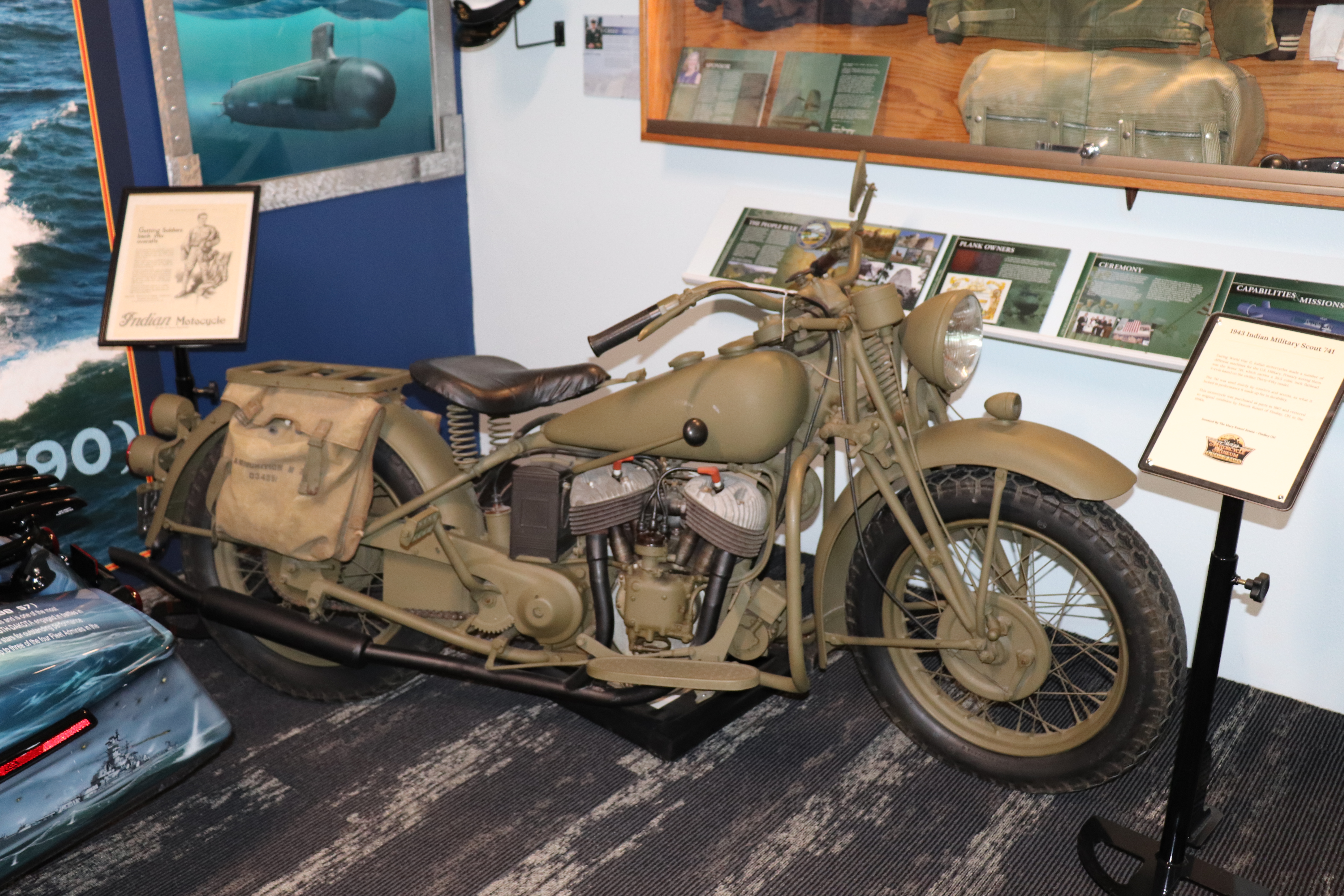 I’ll explain a couple of photos from the museum. The blue box is early GPS. It’s a printed list of directions in a rolling box. Turn one knob and advance the directions, the other knob will roll them back. The black ski looking thing is, well, skis for an Indian motorcycle. The late model bike pictured is a tribute bike to both the USS South Dakota (BB-57) and USS South Dakota (SSN-790). The USS South Dakota (BB-57) was the lead ship of the South Dakota Class battleships (4 in total). It fought extensively in WWII and was scrapped in 1962. The USS South Dakota (SSN-790) is a Virginia Class nuclear submarine still in service. There is a key to this motorcycle onboard the sub and any crew member is able to take this bike out to ride anywhere in the state of South Dakota. I seriously doubt any of them would have much time to travel here and then ride around the state. Still a cool bike and thought.