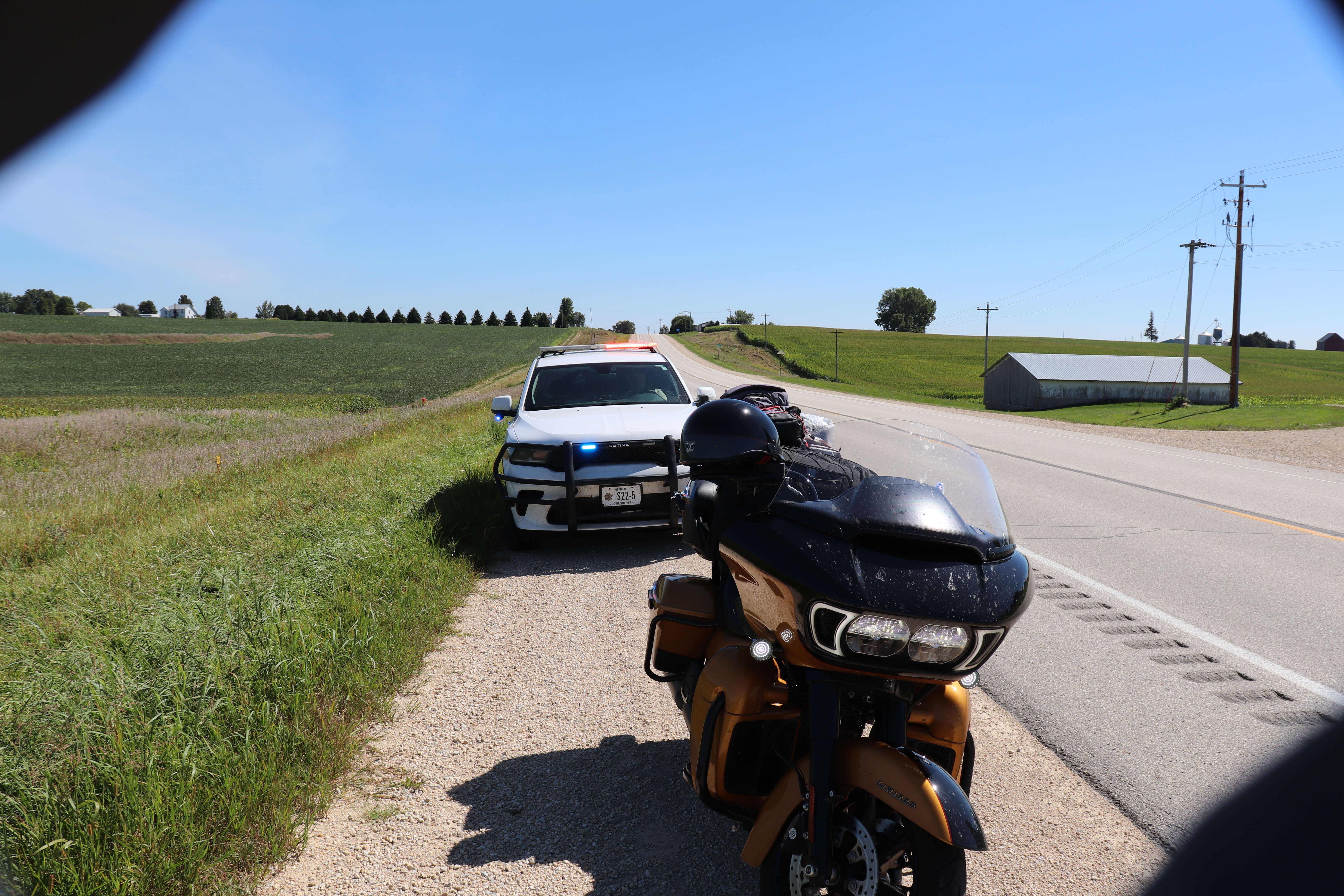 I know I’m speeding. The speed limit has been 55 for miles and doesn’t change for the rest of the day. What I don’t realize is by how much. Not until I spot a figure standing out from behind some corn pointing something at me. Then I realize it’s an officer, and then spot his cruiser as I pass. I back off and hit the speed limit hoping his radar malfunctioned or didn’t pick me up, or maybe he thinks I’m not worth the effort as bikes can be known to run, mostly sport bikes but not cruisers.