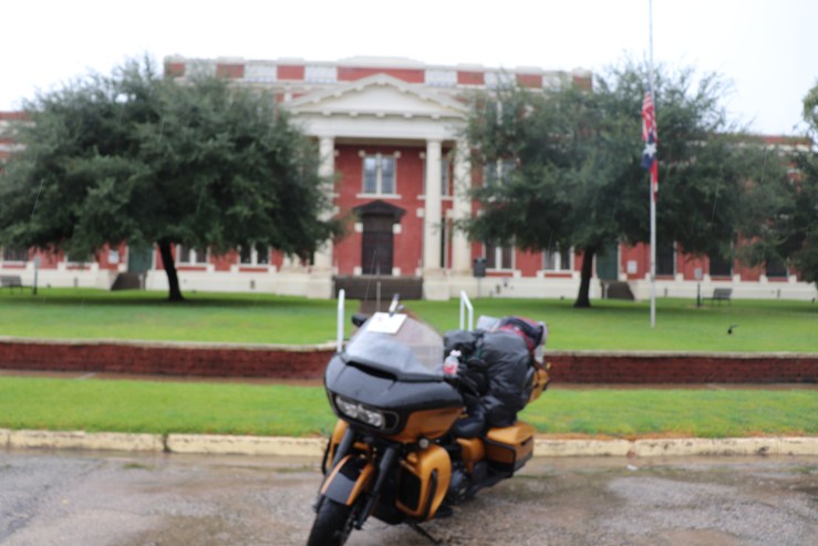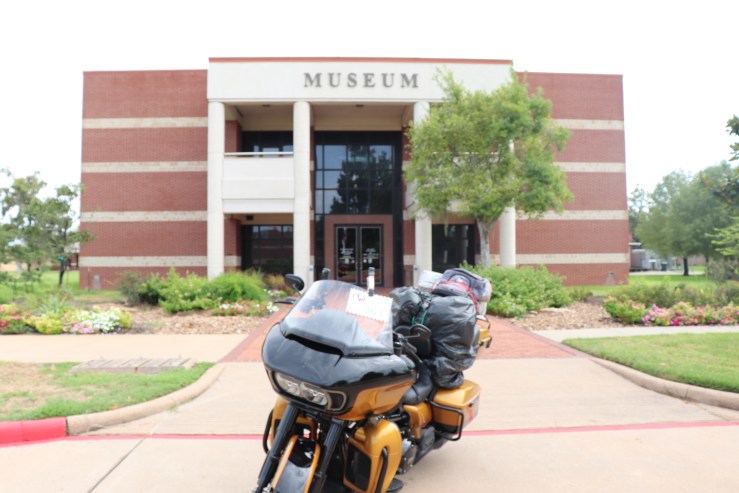 Stop number two is the Lake Jackson Historical Museum. It too is closed due to it being Sunday. Still hot and still very humid. The passing rain and closeness to the coast has created some very heavy air. If you’ll notice in the photo my bag is covered in a large trash bag. The bag was a new addition to last years trip and I love it. It’s curved to fit perfectly in the back seat and it’s changed how I pack the tour pak or trunk. The only drawback is the rain cover that came with it. The cover slips over the top of the bag and cinches down. The problem is that the straps securing the bag are on the bottom so getting the cover to cinch tightly is tough. It flew off somewhere along the way last year so now I tote a couple of the large trash bag and run a bungee cord around it, what I should have done with the cover.