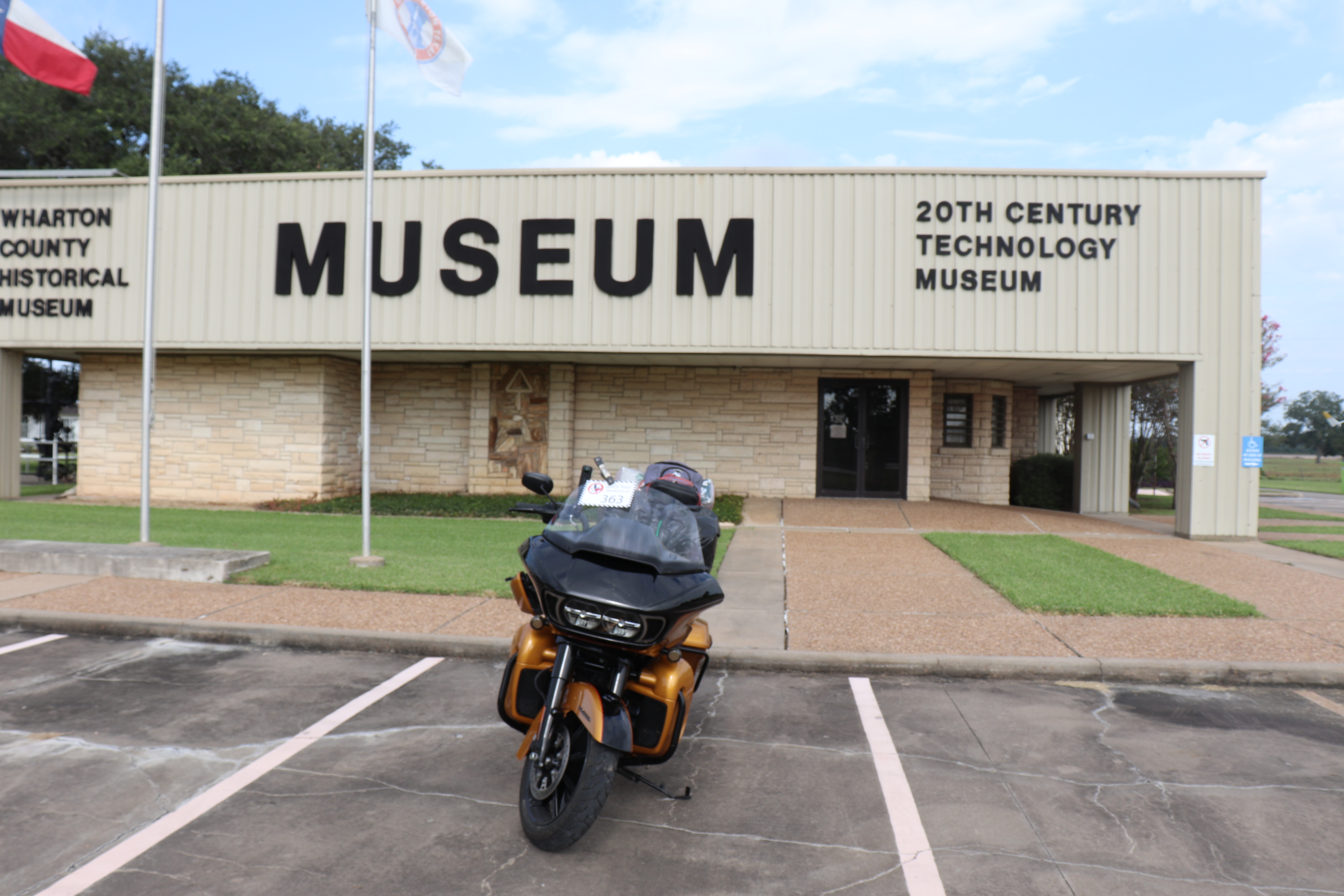 Stop number two is the Lake Jackson Historical Museum. It too is closed due to it being Sunday. Still hot and still very humid. The passing rain and closeness to the coast has created some very heavy air. If you’ll notice in the photo my bag is covered in a large trash bag. The bag was a new addition to last years trip and I love it. It’s curved to fit perfectly in the back seat and it’s changed how I pack the tour pak or trunk. The only drawback is the rain cover that came with it. The cover slips over the top of the bag and cinches down. The problem is that the straps securing the bag are on the bottom so getting the cover to cinch tightly is tough. It flew off somewhere along the way last year so now I tote a couple of the large trash bag and run a bungee cord around it, what I should have done with the cover.