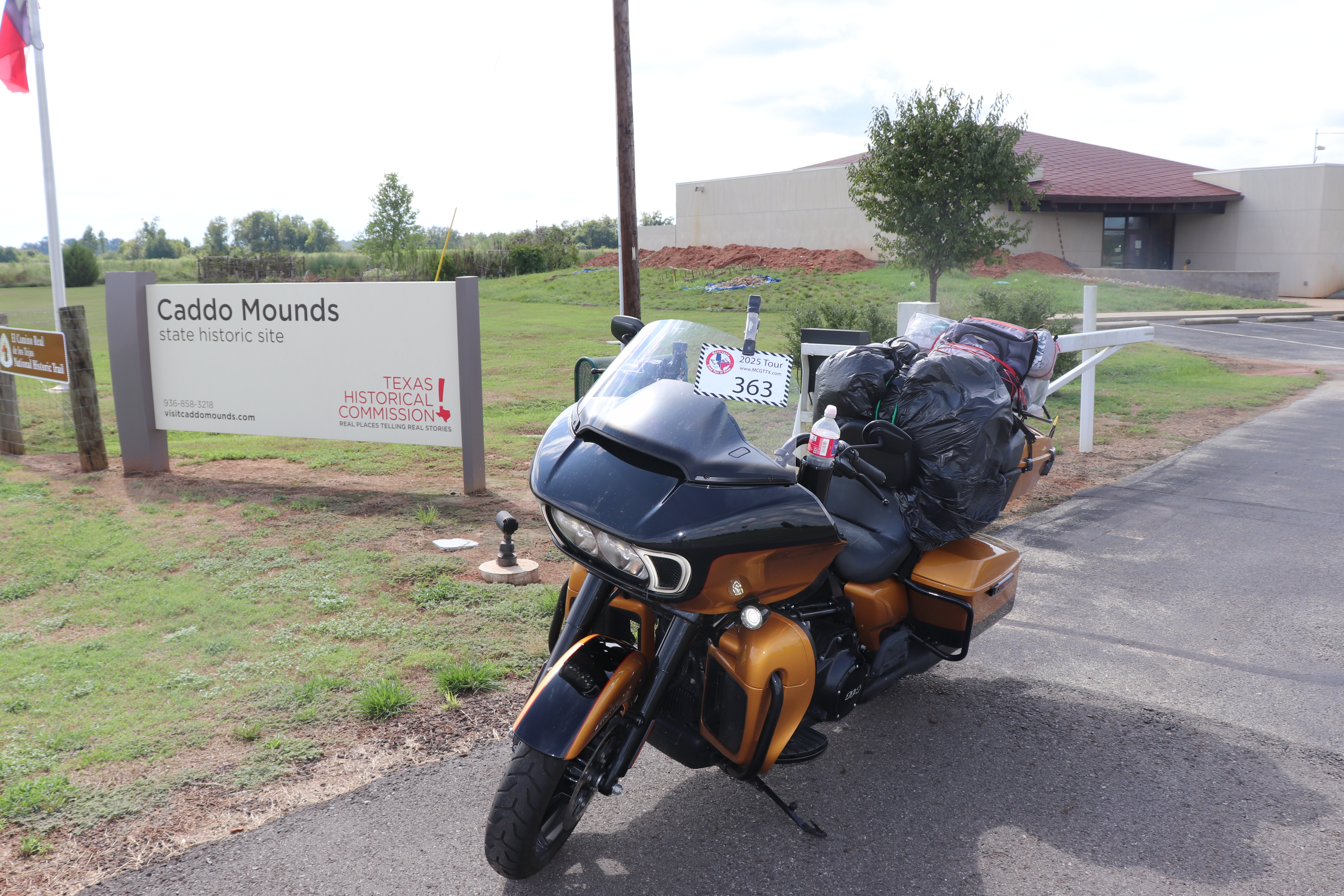 Our next stop is the Caddo Mounds State Historic Site. But getting there was an amazing ride and my favorite part of the day. The roads are mostly two lane and are lined with 100 foot tall trees on both sides, just few feet off the roadway and, at times, stretching out over it. Normally on a hot day this shaded riding is great, still is, but I’m a bit chilly now and with the rain suit still on I’m not drying out. Highway 227 is an amazing road to ride down. I’ve never been on this side of it but do travel on it at least once a year, albeit in the truck. Highway 227 turns into highway 21 which is another great road and runs right past my cousins small ranch, a place the family gathers at for Thanksgiving weekend. I’d love to stop in and see if he’s home but if he is there is no way I can make it a quick trip.