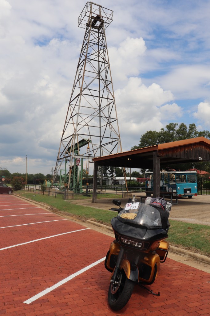 We lose the fun twisty two lane as we near Longview and get back to the four lanes. Then it’s onto I-20 for a few miles before cutting north to Gladewater. The oil derrick is in the center of a brick lined square. I’m unsure of it’s history but it looks like it was working at one point in time. It’s lunch time now and since I’ve missed lunch the first two days I decide to start looking for something to eat. Nothings catching my eye so I decide to just continue on, I’ll find something in Greenville, it’s only 80 miles away.