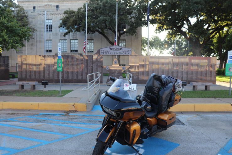It’s a long 100 miles into Graham and it’s been a long day. We arrive just before 7:00 which is late in the day. The stop here is a memorial in front of the Young County Courthouse. The memorial pays tribute to all the live lost in battle from Young County. These range from WWI to the peace time era. There are hundreds of names on this wall. It’s a sad moment as I stand and and look at them all.