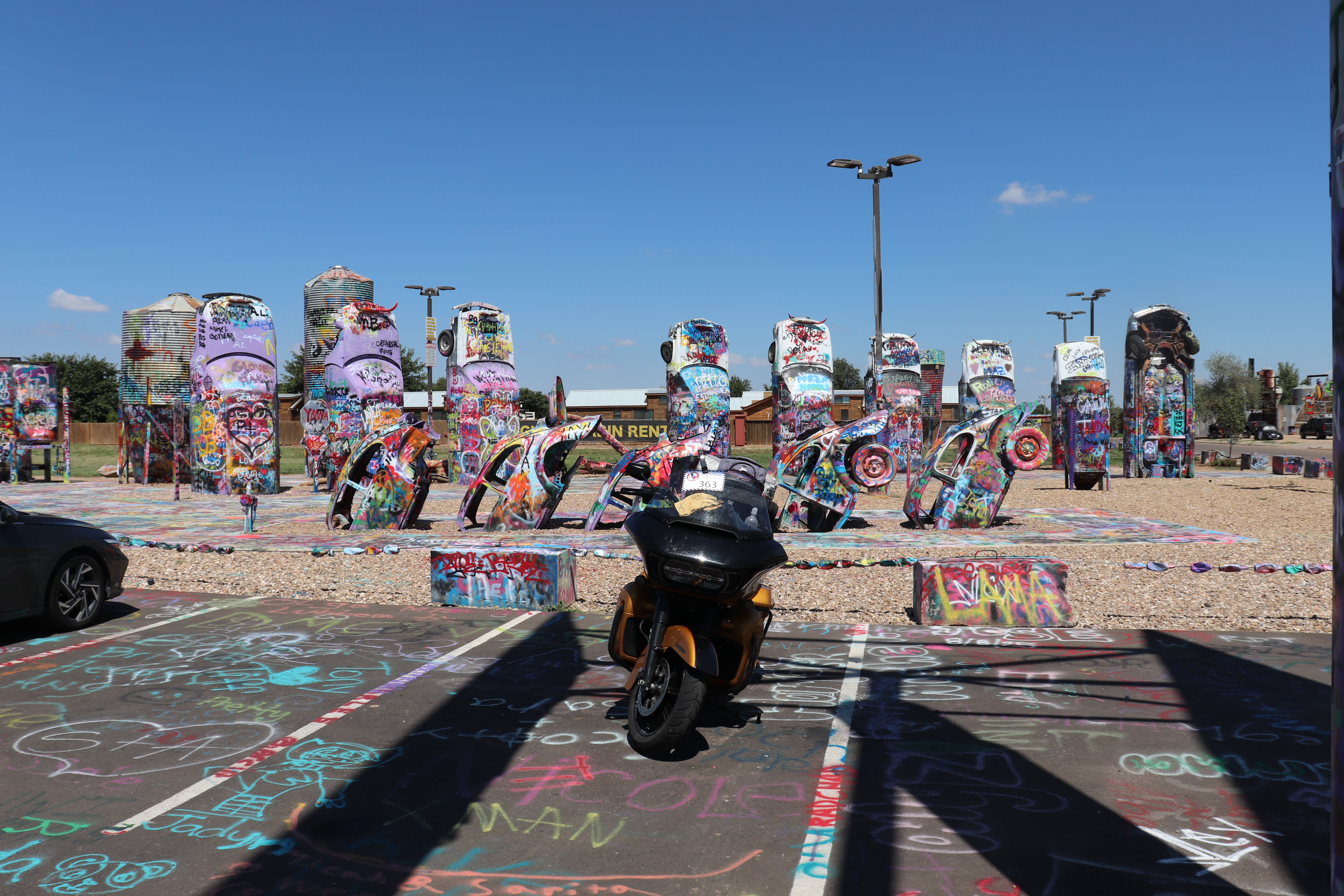 It’s been cool most of the day so far and it’s still a clear sky. We reach our next stop at the Slug Bug Ranch right at 1:00. Cadillac Ranch is well known here in Amarillo and is a row of several Cadillacs buried upright with their noses in the ground and heavily spray painted with graffiti from visitors. Slug Bug Ranch is the same only with Volkswagen Beetles. Not sure what the cars in the back are. There’s a small shop nearby that offers cold drinks, cold beer and spray paint. The whole area is covered in graffiti, much like Cadillac Ranch.