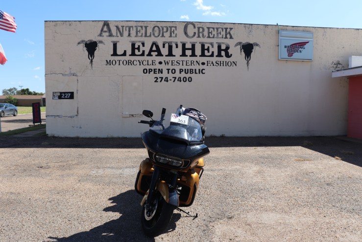 The next stop is in Borger. Getting here is a short ride, only about 30 miles. The ride is much nicer than the run to Pampa. The wind stops and the land begins to roll, the road with it. We’re now twisting our way through the country side. And there’s nothing out here. Just empty land. We reach Borger quickly and arrive at Antelope Creek Leather. I don’t go in as I don’t need any leather right now. I could use a new jacket but mine still works just fine.
